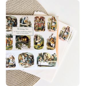 Nydelig brevpapir med motiv fra boken The Nursery Alice, illustrert av Sir John Tenniel (1820-1914), som er en forkortet utgave av klassikeren Alice in Wonderland av Lewis Carroll.