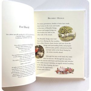 Brambly Hedge is on the order side of the stream, across the field. If you can find it, and if you look very hard amoungst the tangled roots and stems, you may even see a wisp of smoke from a small chimney, or through an open door, a steep flight of stairs deepwithin the trunk of a tree. For this is the home of the mice of Brambly Hedge.